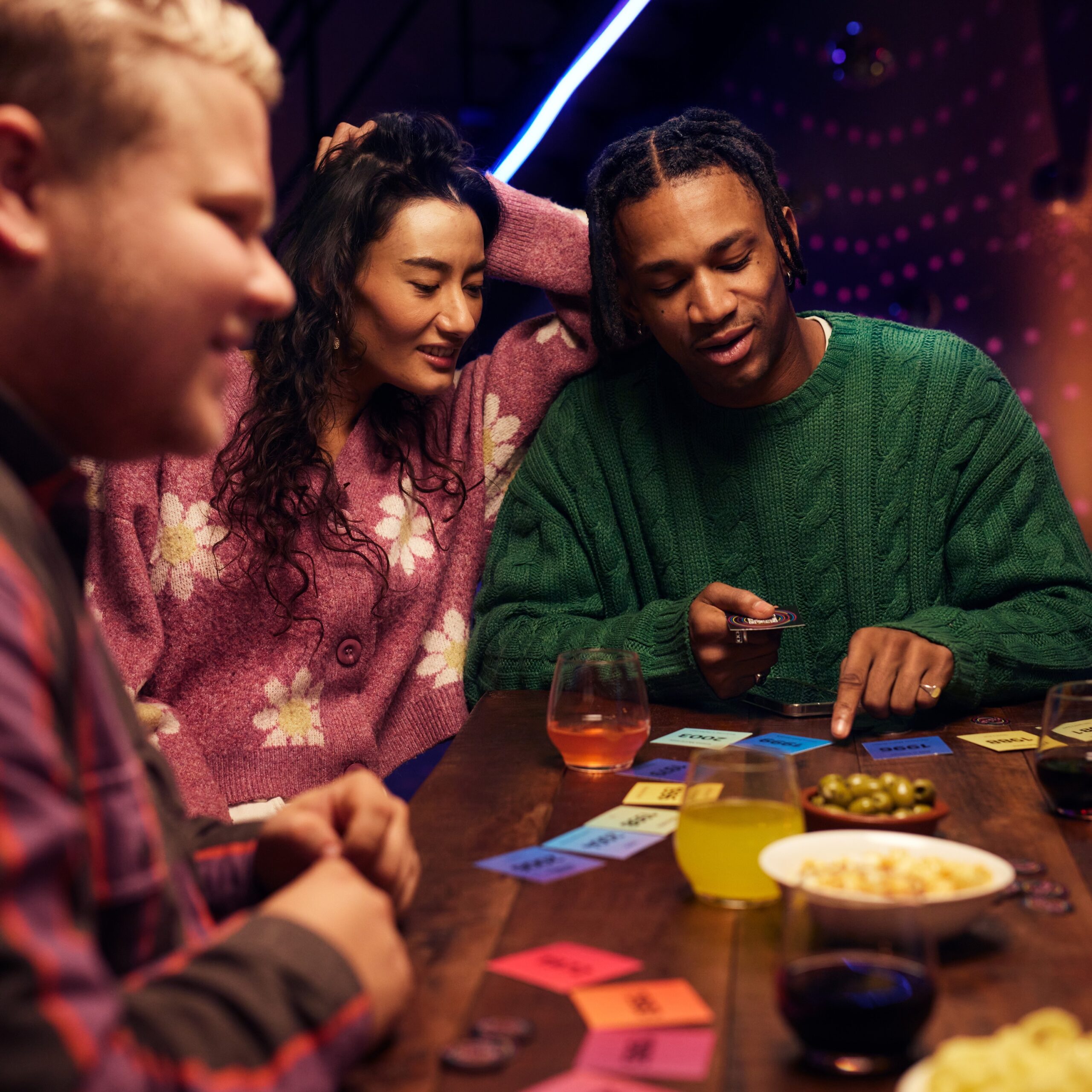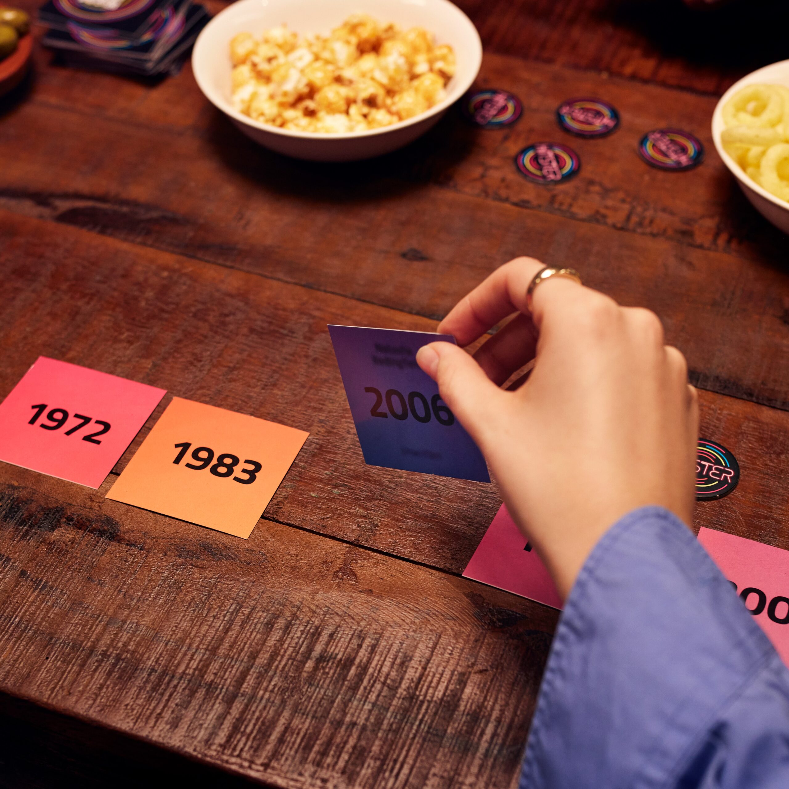 Play together as one team. Start with 5 tokens and 1 music card to begin your timeline. Work together to place new cards in the right spot – if you’re wrong, lose a token. Collect 10 cards before running out of tokens to win.